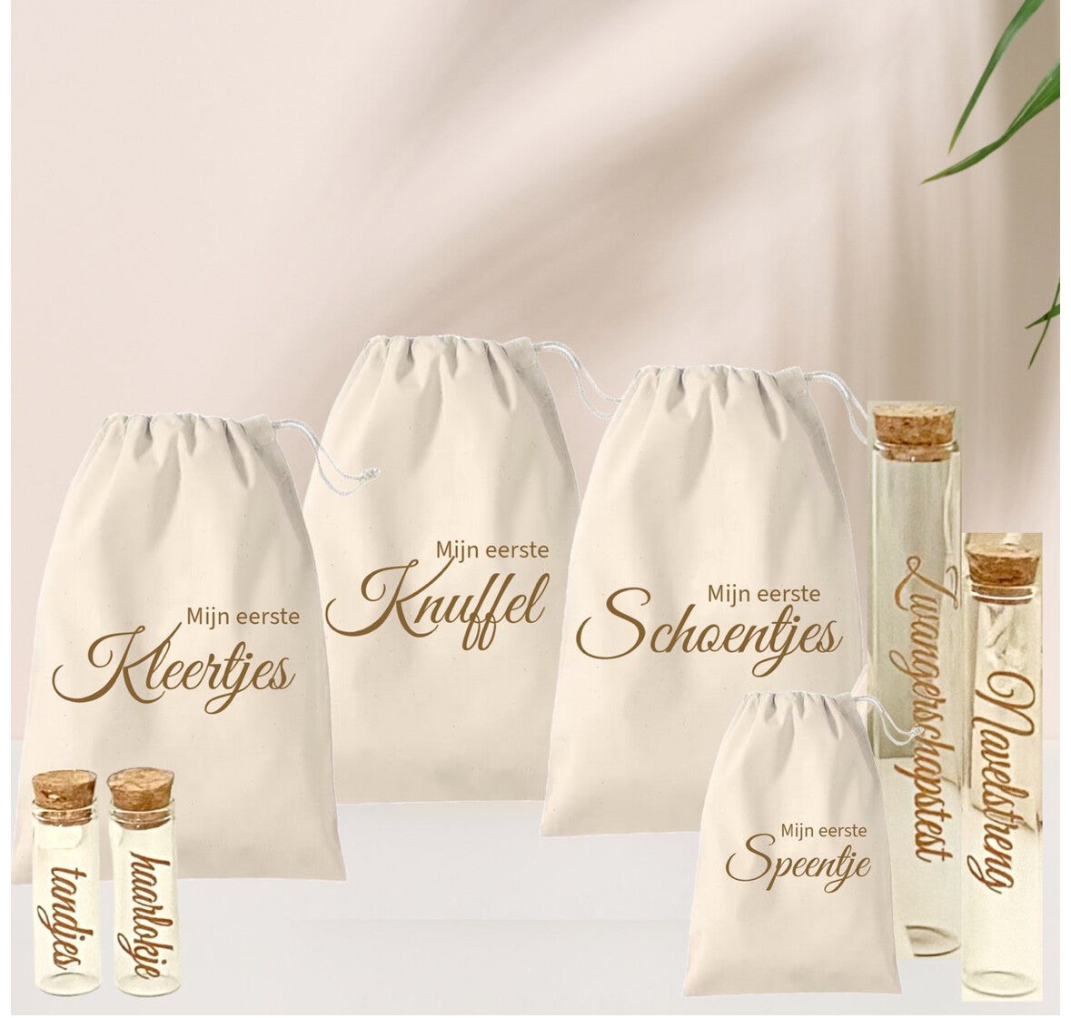 Bewaarzakken set8 delig | eerste knuffel | eerste kleertjes | eerste schoentjes | eerste speentje | zwangerschaptest | navelstreng | herinneringen baby | tandjes | haarlokje |